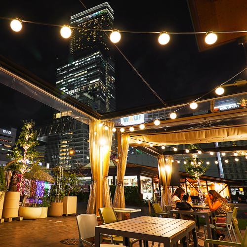 てんしばを吹き抜ける心地よい風を感じながら味わう薪火料理は、まさに絶品です。昼間は自然の風を感じながら、友人や大切な人と楽しいひとときを過ごせます。夜になると、あべのハルカスや都会の美しいライトアップが目の前に広がり、ロマンティックな雰囲気の中でゆったりとしたお食事の時間をお楽しみいただけます。
